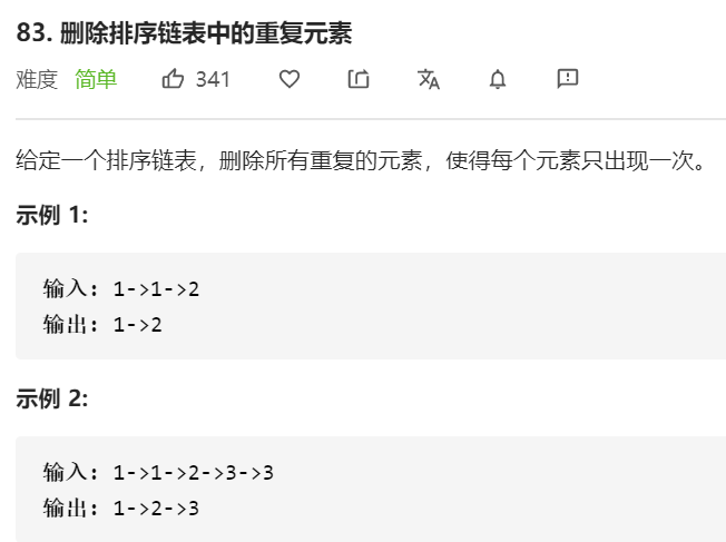 判断当前节点currentNode的值和它的next指针所指向的节点的值是否相等,如果相等,就一直向后移动next指针直到遇到 next指针所指节点的值和currentNode的值不相等,这时将currentNode的next指针指向这个不相等的节点即可。 当currentNode和currentNode的next指针都为空时退出while循环,表示扫描链表结束(currentNode为空表示链表末尾已经指向NULL)。