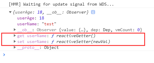 根据官方文档定义:如果在实例创建之后添加新的属性到实例上,它不会触发视图更新。 其实仔细看控制台的信息,可以发现在下面有一对关于 userName 的 get 和 set 方法: