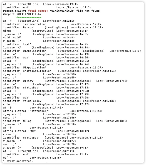 clang -fmodules -E -Xclang -dump-tokens Person.m