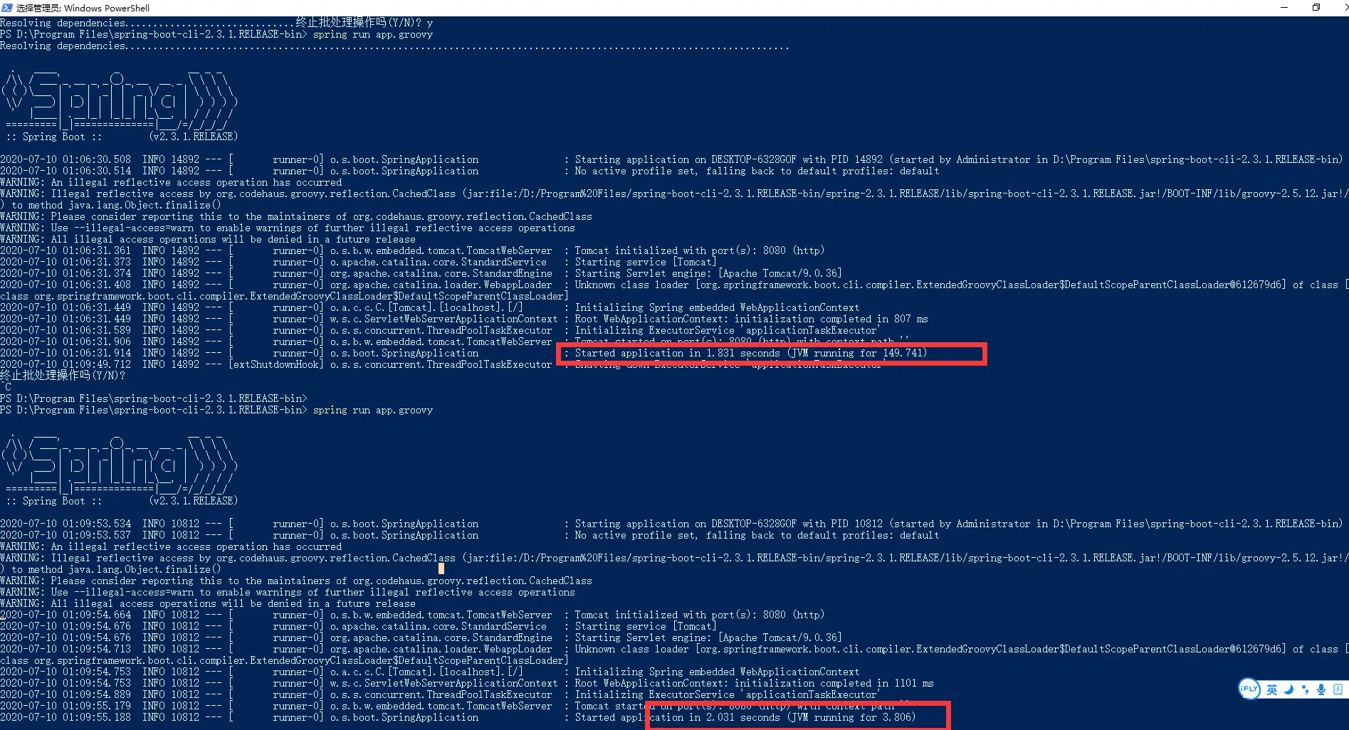 电脑配置 i7 16G jdk14 spring-boot-cli 裸跑测试demo,平均2秒左右
