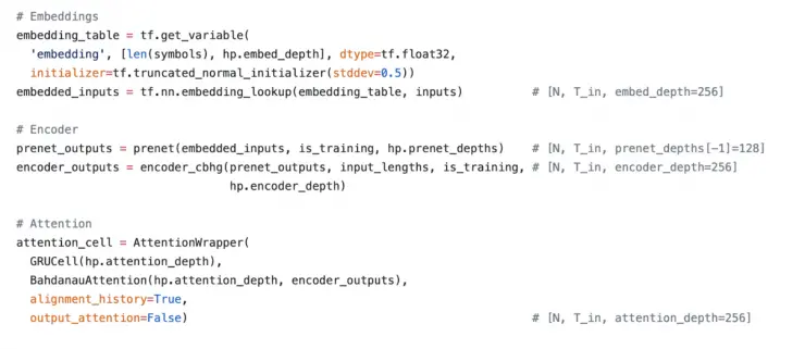 至少要养成在代码中添加维度注释的习惯,让读者可以直接阅读而不需要记忆大量信息。请前往以下地址查看 Keith Ito 实现 beautifulTacotron 的代码,这是一个注释的优秀范例: