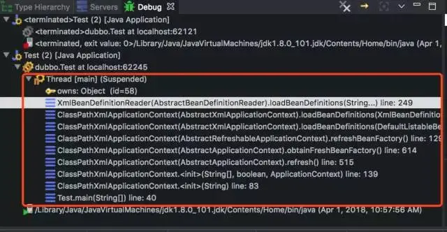 这个时候再按F5会真正进入ClassPathXmlApplicationContext构造方法。 当我们断点跟踪Spring这种源码的时候,一定要有节奏,以优先找到整体脉络为准,不要一直的F5进入每一行细看,F5下去,几天都走不完Spring。能熟练在Spring这种框架中F5、F6、F7、F8,就离弄懂他不远了。 Dubug的时候还应该注意debug视图的线程栈: