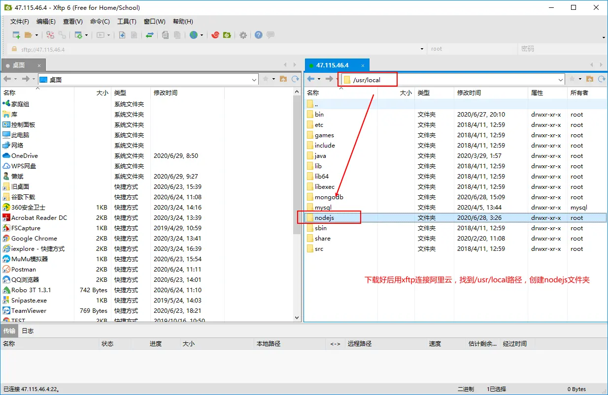 下载好后用xftp连接阿里云,找到/usr/local路径,创建nodejs文件夹