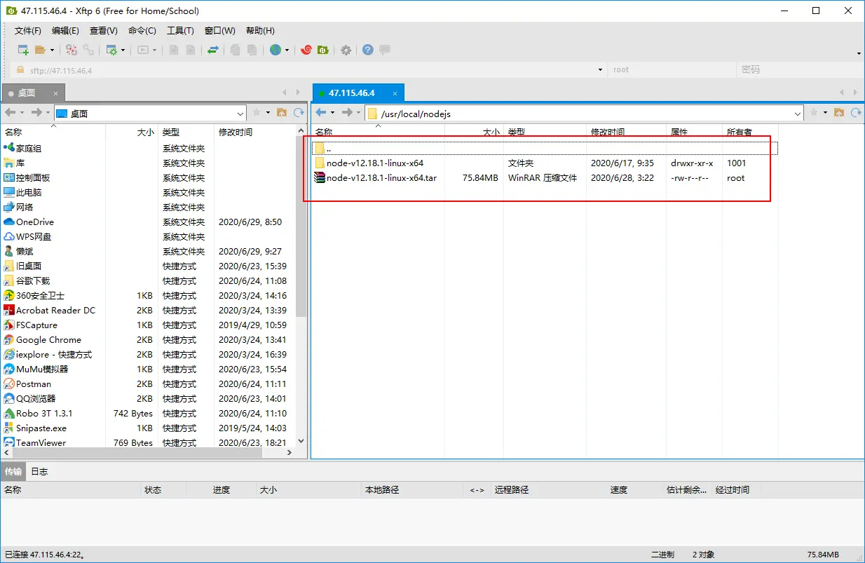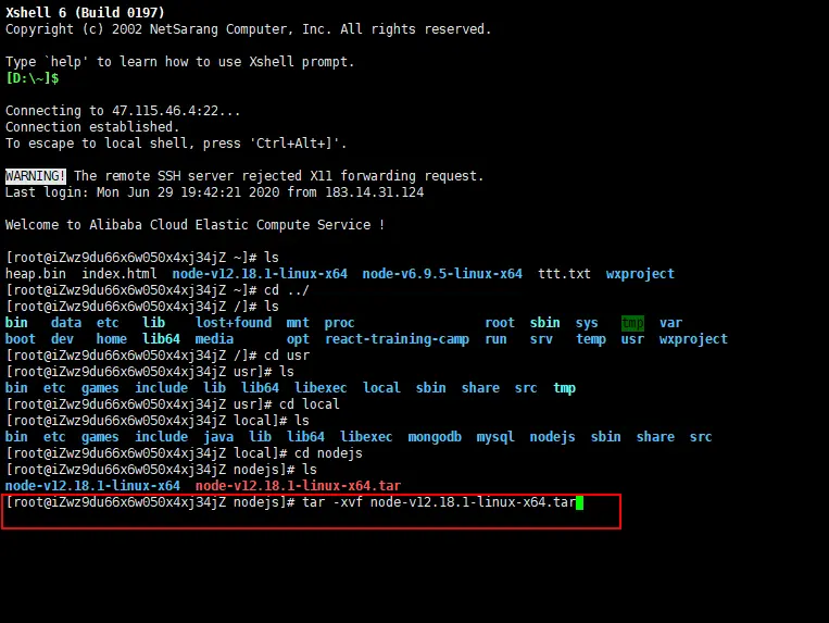 把下载好的node包拖到文件夹下,然后用Xshell连接并进入到文件夹下用指令进行解压
