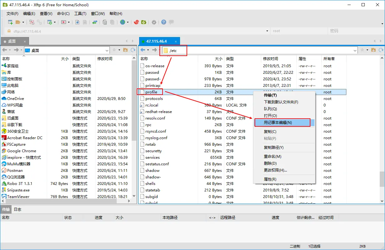 这里修改第一种环境变量,直接用xftp进入到etc文件夹,右键编辑profile文件