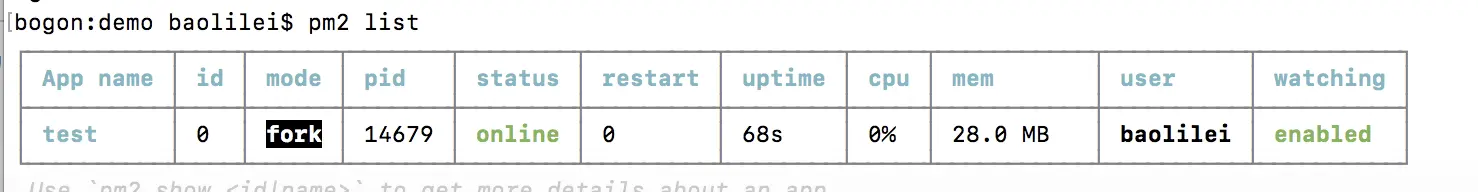 $ pm2 list # 显示所有进程状态