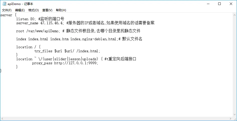 location ~ \/(user|slider|lesson|uploads) { #t重定向后端接口,端口和你node的端口要一致