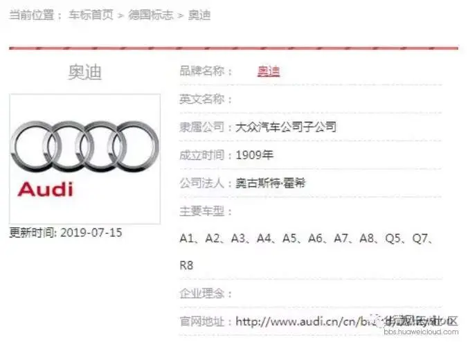 网站将车系按照字母从A-Z进行了排序,然后点击每个车标进入详细信息,那Audi做例子: