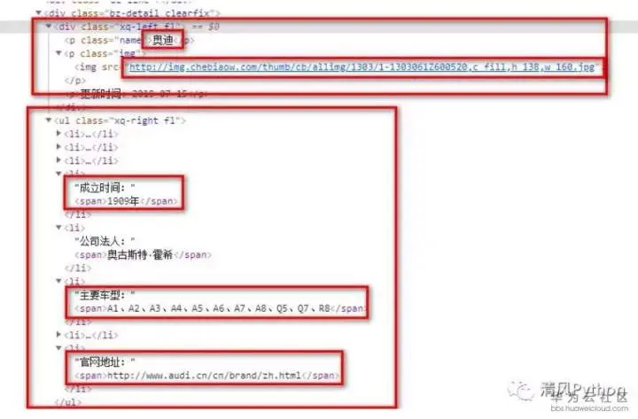 进入品牌详情界面后,我们针对左右栏目的设置,分别获取所需标红的内容