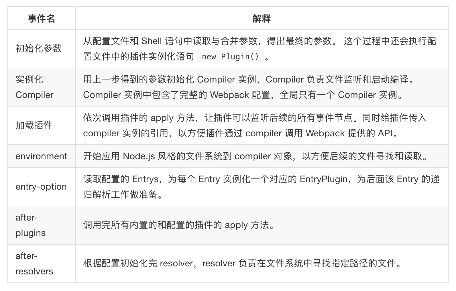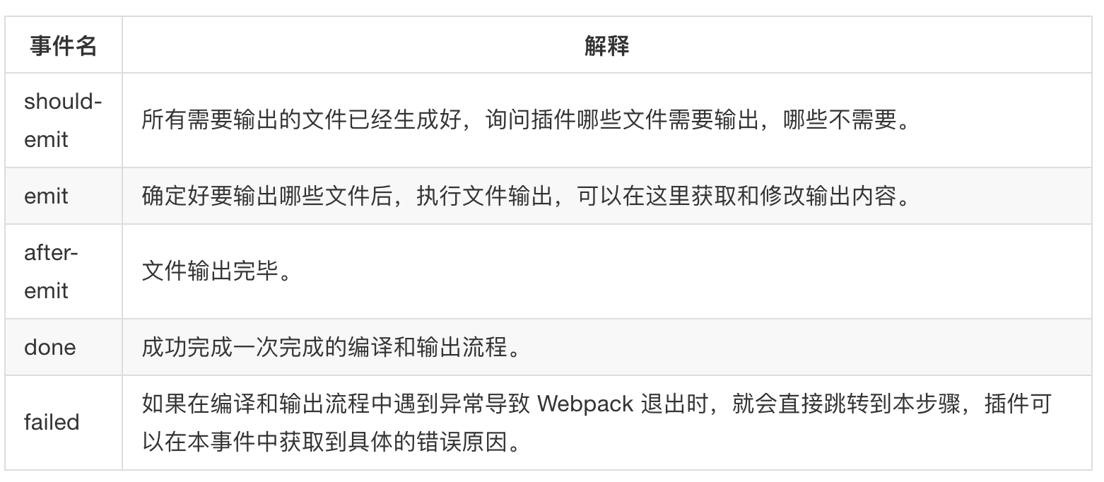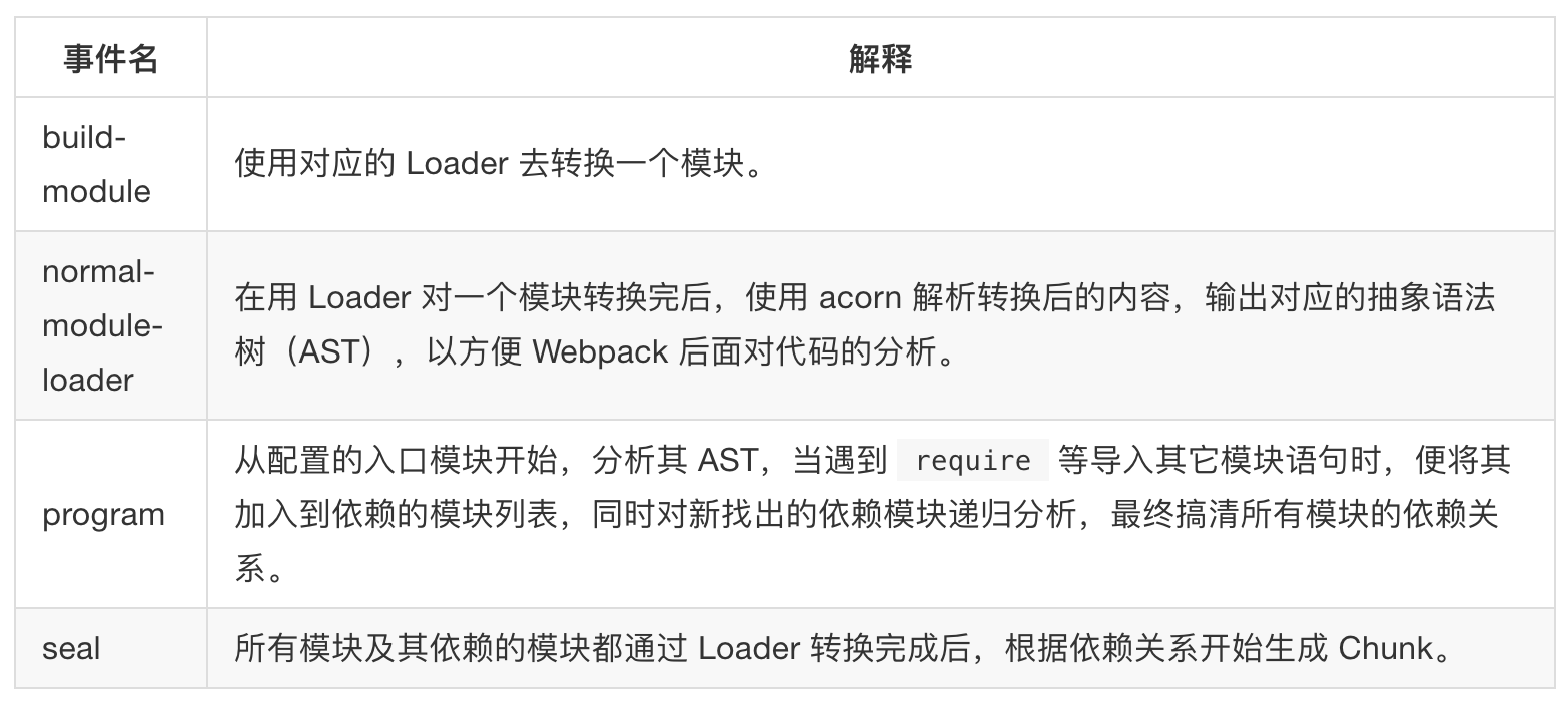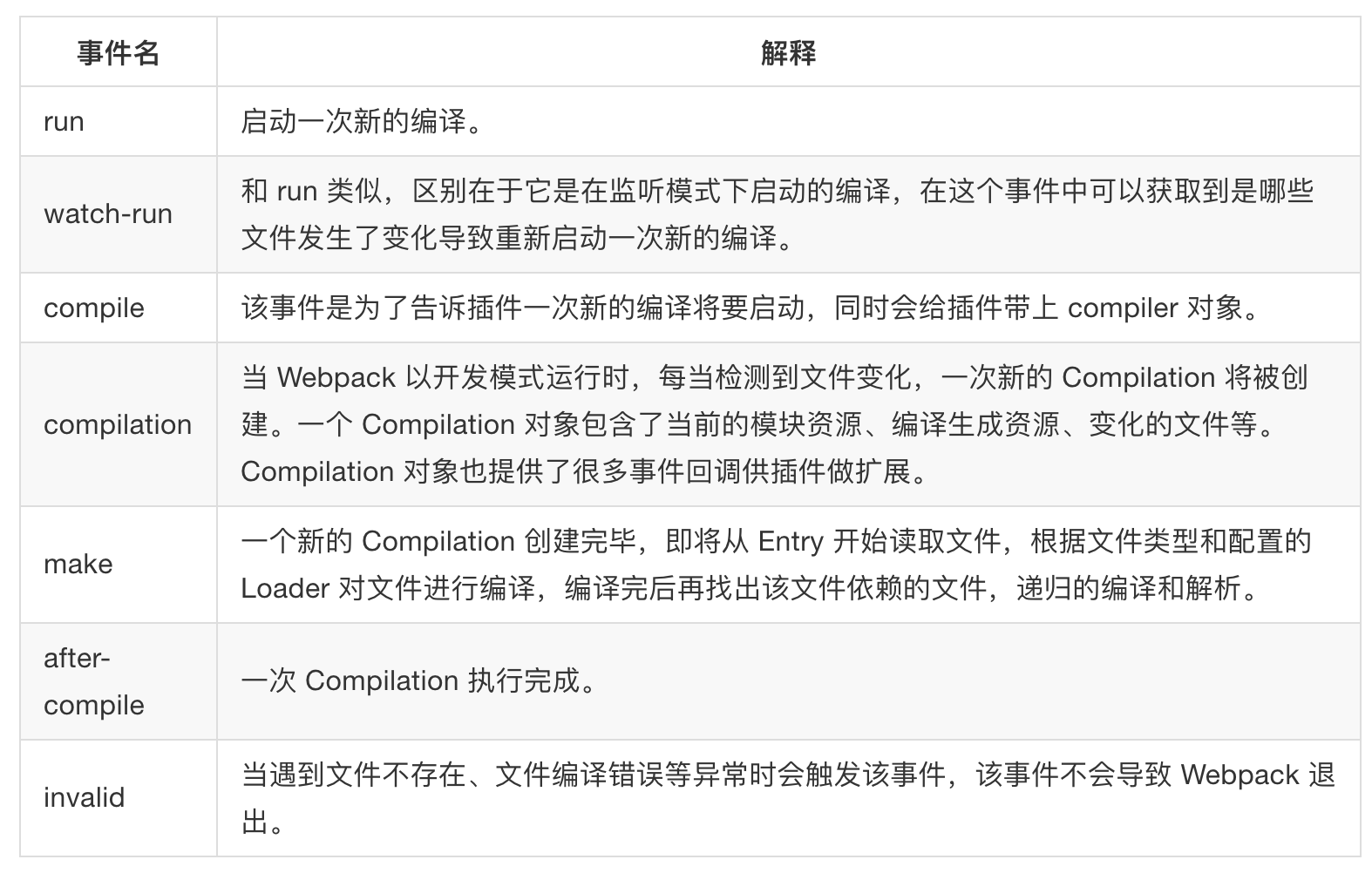 在编译阶段中,最重要的要数 compilation 事件了,因为在 compilation 阶段调用了 Loader 完成了每个模块的转换操作,在 compilation 阶段又包括很多小的事件,它们分别是: