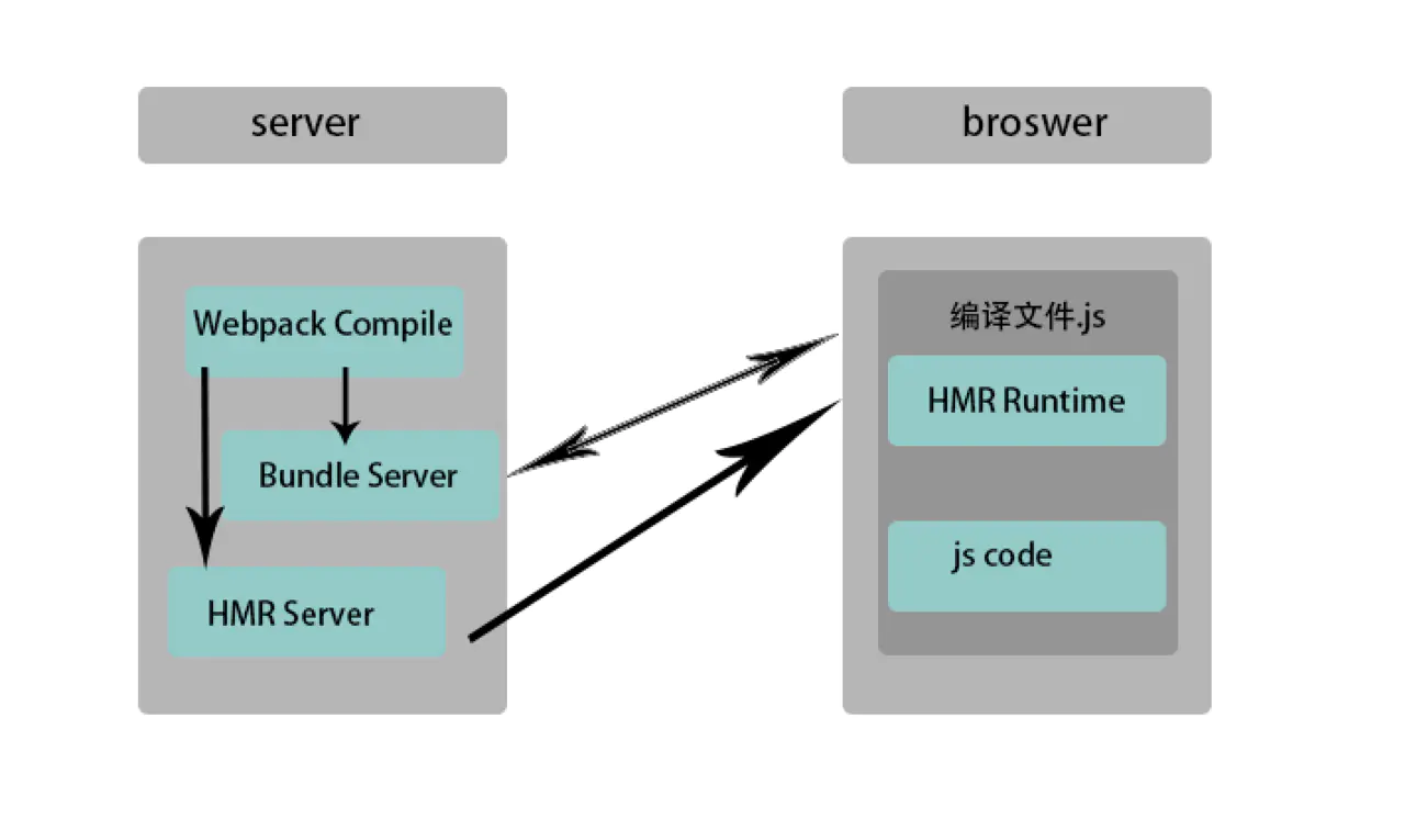 整个的过程我们可以简化一下, Webpack Compile打包文件传输给Bundle Server,Bundle Server就是一个服务器,然后会执行这些编译后的文件,让浏览器可以访问到。当文件产生变化时,Webpack Compile编译之后会通知到HMR Server,HMR Server就会通知浏览器端的HMR Runtime做出修改。 HMR Runtime是会被打包到编译后的js文件内,然后和HMR Server建立websocket通信关系,这样就可以实时更新修改。
