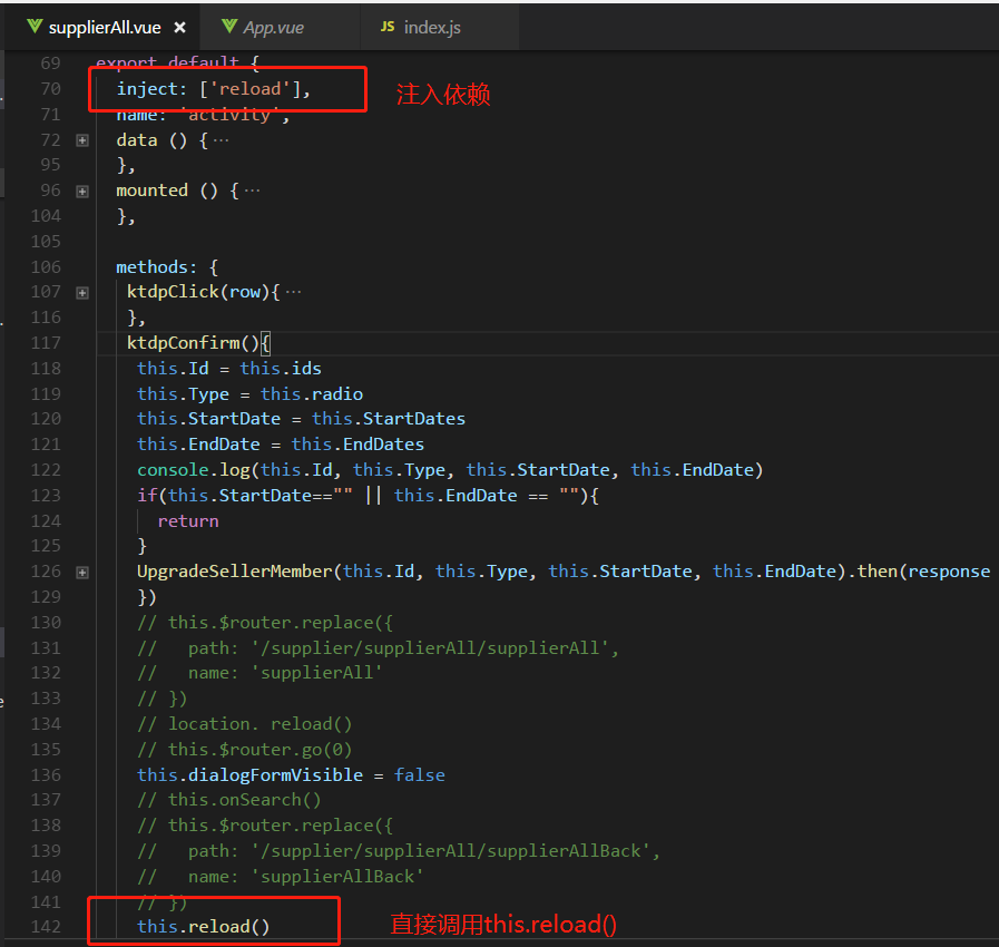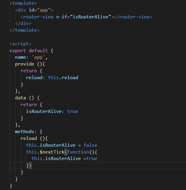 vue项目刷新当前页面的方法 听说会走远 2020-07-03 283 阅读1分钟 provide / inject 组合 方式是我试过最实用的,下面用项目截图给大家说明下:首先,要修改下你的app.vue 通过声明reload方法,控制router-view的显示或隐藏,从而控制页面的再次加载,这边定义了isRouterAlive //true or false 来控制 然后在需要当前页面刷新的页面中注入App.vue组件提供(provide)的 reload 依赖,然后直接用this.reload来调用就行
