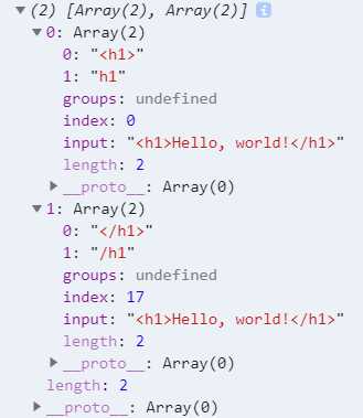 它返回包含匹配项的可迭代对象,而不是数组。我们可以用 Array.from 从中得到一个常规数组。 每个匹配项均以包含分组的数组形式返回(返回格式与不带 g 标记的 str.match 相同)。 如果没有结果,则返回的不是 null,而是一个空的可迭代对象。