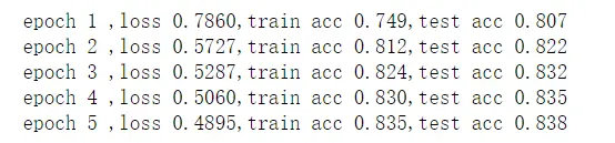 print('epoch %d ,loss %.4f,train acc %.3f,test acc %.3f'