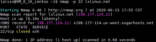 现在我们再来试试关闭的端口。我们来测试一下 22 端口,这个端口没有被 nmap 扫描出来,所以应该是关闭的。为了保险起见,我们可以用 nmap 再来确认一下,这时我们要加上 -p 选项。
