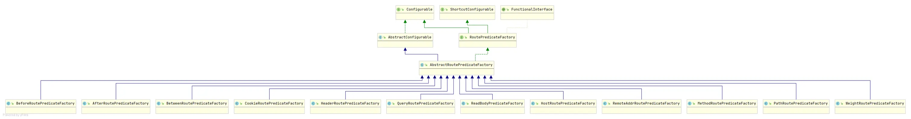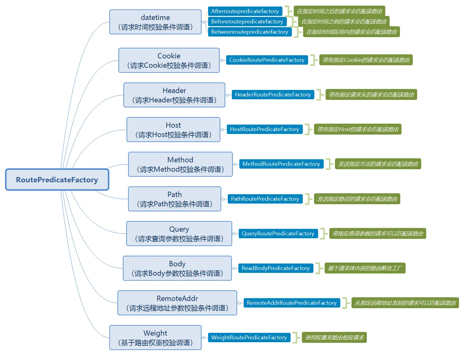 Spring Cloud Gateway将路由匹配作为Spring WebFlux HandlerMapping基础架构的一部分。 Spring Cloud Gateway包括许多内置的Route Predicate工厂。 所有这些Predicate都与HTTP请求的不同属性匹配。 多个Route Predicate工厂可以进行组合。 Spring Cloud Gateway内置了许多Predict,这些Predict的源码在org.springframework.cloud.gateway.handler.predicate包中,如果读者有兴趣可以阅读一下。现在列举各种Predicate如下图: