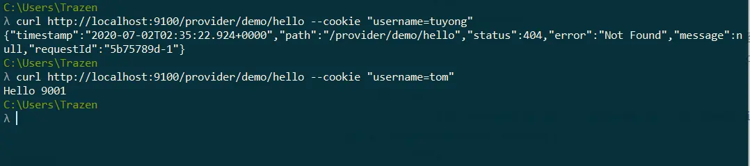 使用curl工具测试如下,只有cookie为 username=tom 的请求可以匹配该路由。