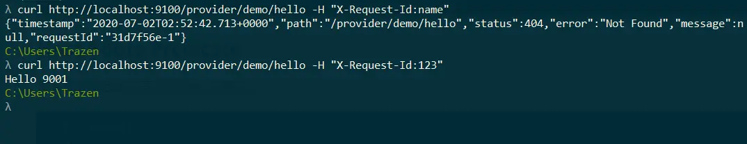 使用curl工具测试如下,只有名为X-Request-Id,并且值符合正则\d+的Header时可以匹配该路由。