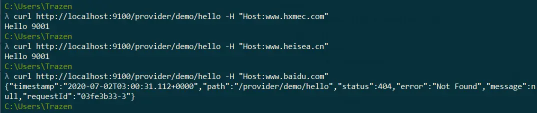 使用curl工具测试如下,只有带有请求头名为Host的Header符合**.hxmec.com或者**.heisea.cn时请求可以匹配该路由。
