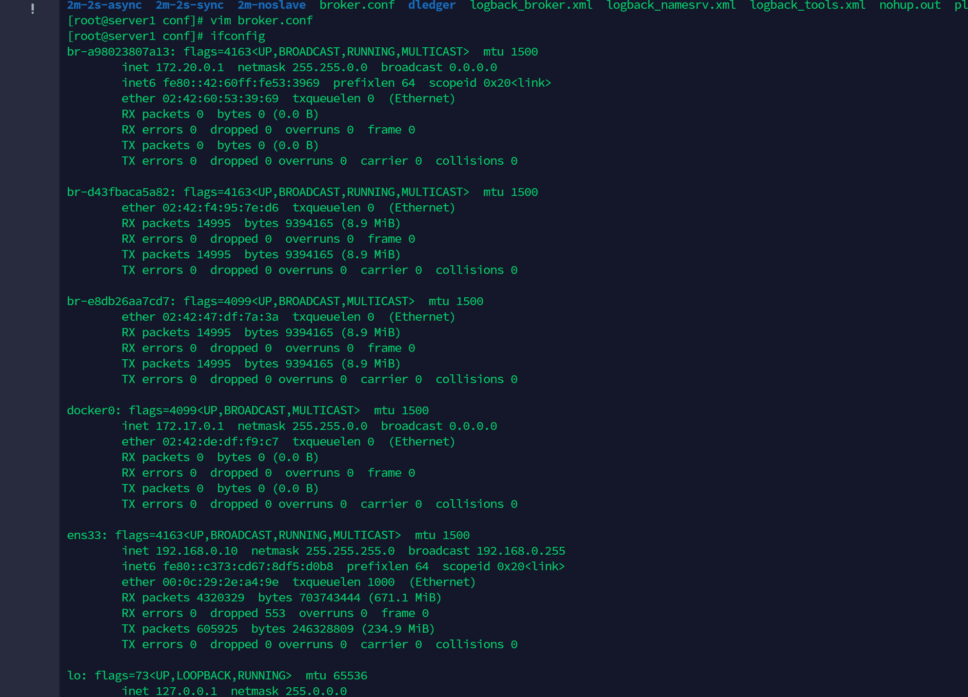 百度了下,意思是mq里的broker用的是第一个网卡,而我这台机器上装了docker