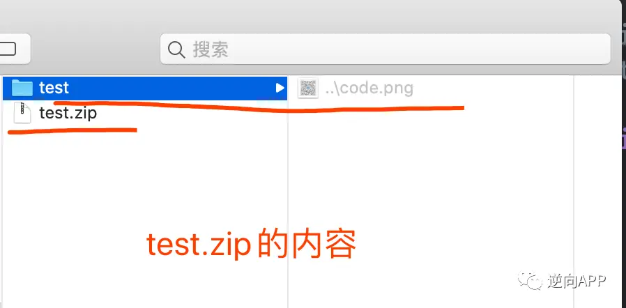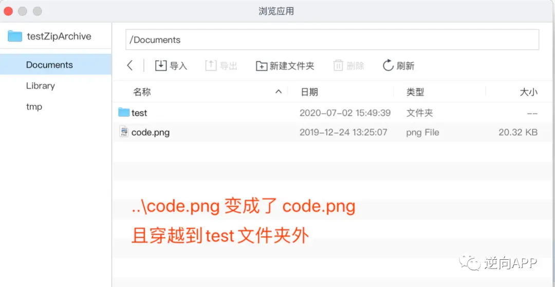 7、执行完解压后,app的Documents路径下, "..\code.png"文件穿越到了test文件夹外: