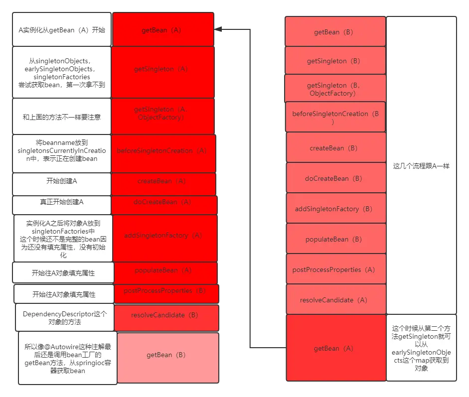 其实最主要的就是 singletonFactories 这个map,A会先实例化好对象,然后把对象放到这个map中去,然后再填充属性的时候需要依赖注入B,实例化B的之后,往B填充属性的时候,依赖注入A,这时候会从singletonFactories这个map中获取对象,但是这个对象还没有完成属性填充和初始化,B拿到A的对象之后,B进行属性填充和bean的初始化,然后依赖注入给了A对象,完成循环依赖。