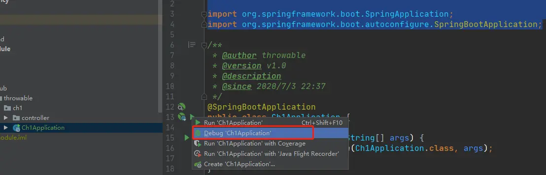 接着编写一个启动类club.throwable.ch1.Ch1Application,启动类是SpringBoot应用程序的入口,需要提供一个main方法: