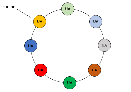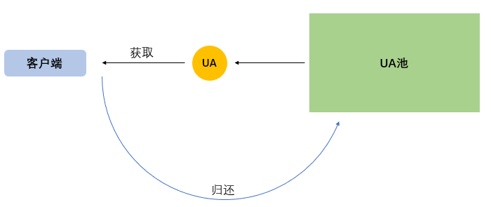 上图中,假设不同颜色的UA是完全不同的UA,它们通过洗牌算法打散放进去环形队列中,实际上每次取出一个UA之后,只需要把游标cursor前进或者后退一格即可(甚至可以把游标设置到队列中的任意元素)。最终的实现就是:需要通过中间件实现分布式队列(只是队列,不是消息队列)。