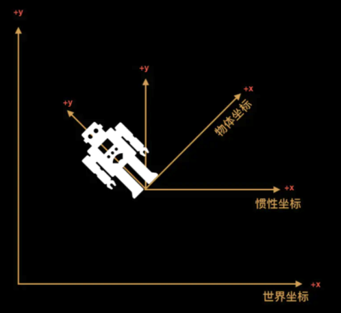 惯性坐标的原点和物体坐标重合,但是惯性坐标的x,y,z轴和世界坐标的x,y,z轴是平行的,这样做的好处是从物体坐标转换到惯性坐标只需要旋转,从惯性坐标到世界坐标只需要平移。