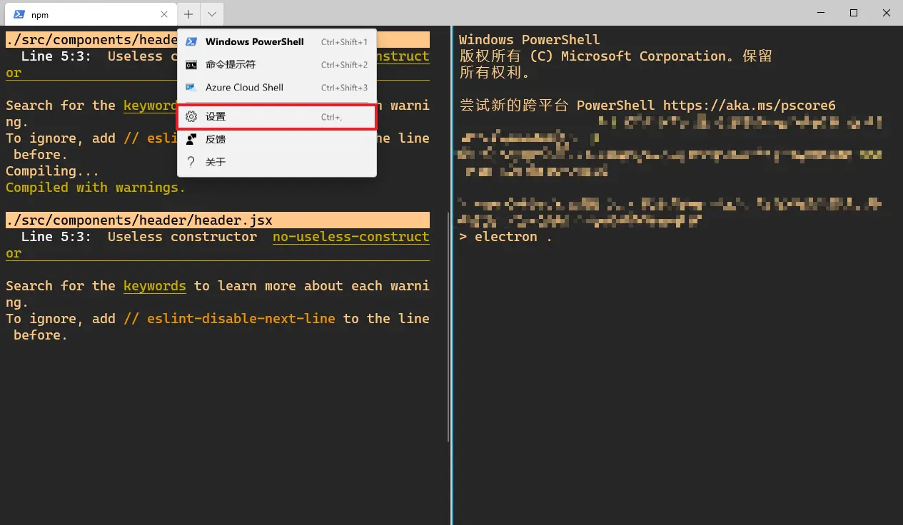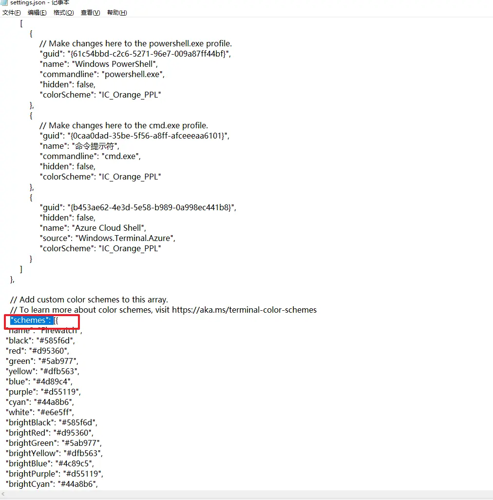 windows terminal自定义主题和快捷键 鱼和牛角我都有 2020-07-04 2,712 阅读1分钟 快捷键 1. 分屏 shift+alt+"+" 横向分屏一个 shift+alt+"-" 竖向分屏一个 自定义主题 打开终端的菜单,找到设置 在这个地址获取主题设置 也可以自己配置https://atomcorp.github.io/themes/,找到自己喜欢的主题 点击get theme 把配置复制到刚才打开的文件配置项中,贴到schemes里面 在配置项中找到profiles,设置主题
