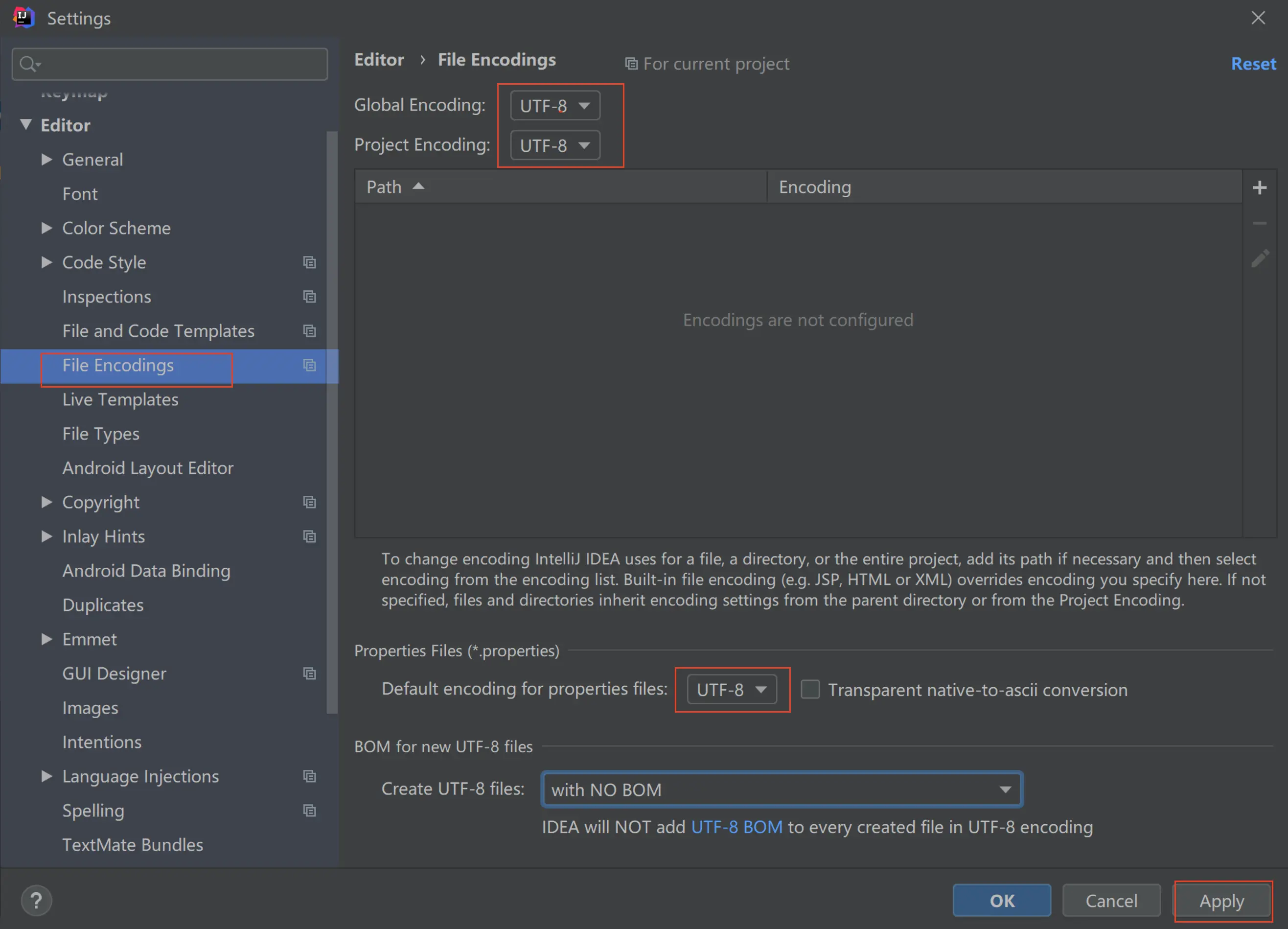 选择 "Editor",选择 "File Encoding",设置编码为 "UTF-8"