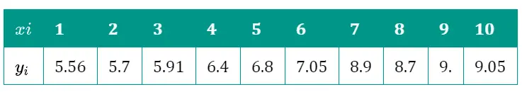y = np.array([5.56, 5.70, 5.91, 6.40, 6.80, 7.05, 8.90, 8.70, 9.00, 9.05])