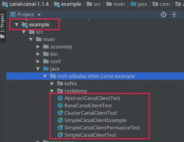 首先先从 canal 源码中寻找官方提供的 Demo,其示例代码在 example 包中,如下图所示: