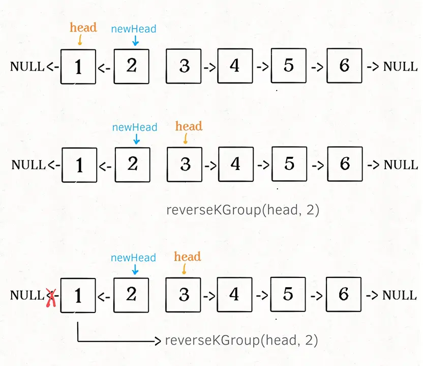 k + 1个元素作为head递归调用reverseKGroup函数。 - 将上述两个过程的结果连接起来