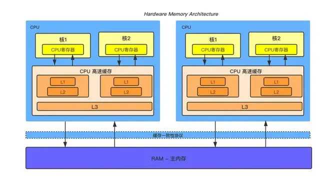 我们以多核 CPU 为例,每个CPU 核都包含一组 「CPU 寄存器」,这些寄存器本质上是在 CPU 内存中。CPU 在这些寄存器上执行操作的速度要比在主内存(RAM)中执行的速度快得多。