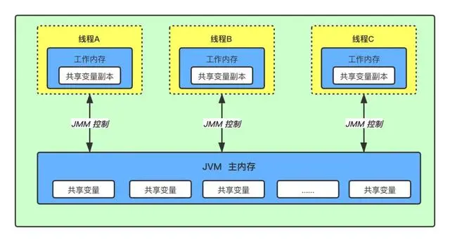- 工作内存:每条线程都有自己的工作内存(Working Memory,又称本地内存,可与CPU高速缓存类比),线程的工作内存中保存了该线程使用到的主内存中的共享变量的副本拷贝。线程对变量的所有操作都必须在工作内存进行,而不能直接读写主内存中的变量。工作内存是 JMM 的一个抽象概念,并不真实存在。