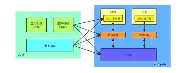 Java 内存模型和硬件内存体系结构也没有什么关系。硬件内存体系结构不区分栈和堆。在硬件上,线程栈和堆都位于主内存中。线程栈和堆的一部分有时可能出现在高速缓存和CPU寄存器中。如下图所示:
