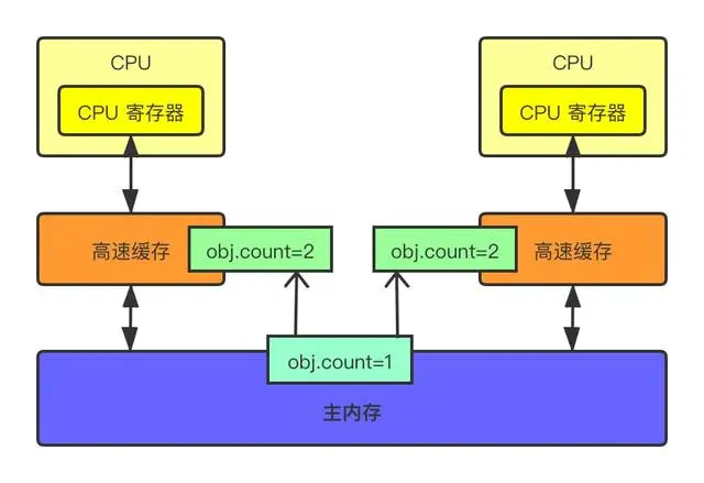 想象一下,如果线程A将一个共享对象的变量读入到它的CPU缓存中。此时,线程B执行相同的操作,但是进入不同的CPU缓存。现在线程A执行 +1 操作,线程B也这样做。现在该变量增加了两次,在每个CPU缓存中一次。