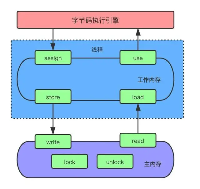 - assign(赋值):作用于工作内存的变量,它把一个从执行引擎接收到的值赋给工作内存的变量,每当虚拟机遇到一个给变量赋值的字节码指令时执行这个操作。