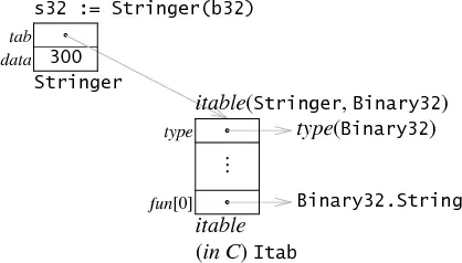 实际的值到底是通过指针引用还是直接存储,取决于值类型的大小。编译器可以根据传递进来的值来安排具体的类型来进行正确的调用。如果接受值正好是一个字长,那么可以直接使用;如果不是的,那么可以指针引用。图中展示了,Binary版本的 itable 中实际调用的方法是(*Binary).String,而在Binary32版本中调用的方法是Bianry32.String。