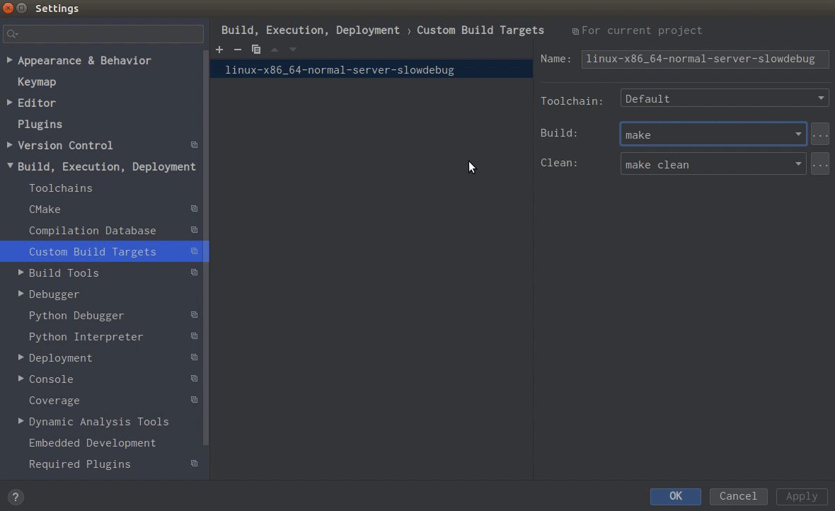 Build Target。点击File菜单栏,Settings | Build, Execution, Deployment | Custom Build Targets,点击+新建一个Target。Name:Target的名字,之后在创建Run/Debug配置的时候会看到这个名字- 点击