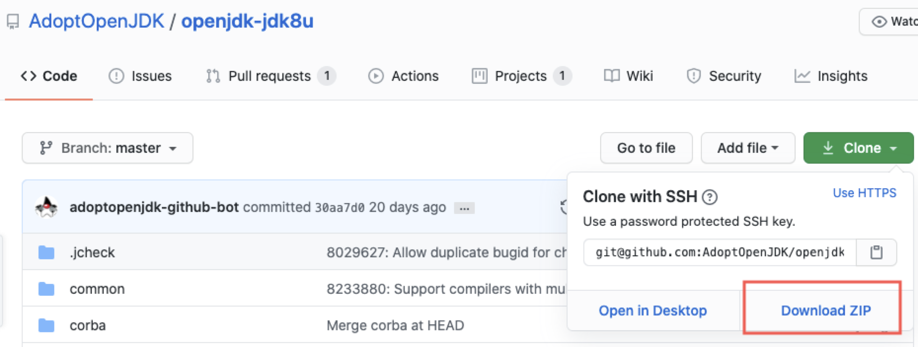 我们这里选择从AdoptOpenJDK的GitHub仓库下载源代码。
