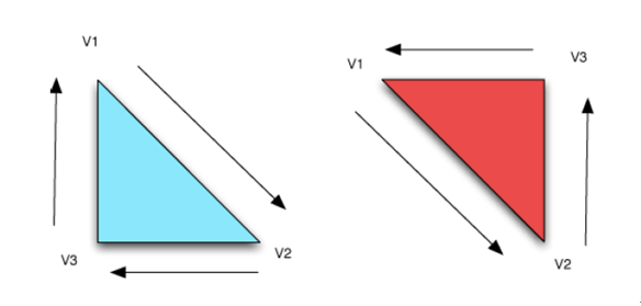 网格的每一个面片都是一个多边形,因此具有两面性。如果遵从在 中声明的顶点顺序来查看每一个表面,顶点将呈现出顺时针或逆时针的运动方向(如下图)。显然,如果从页面的后面看同一个多边形面片,顶点的运动方向则是恰好相反的。如果在两个面片
