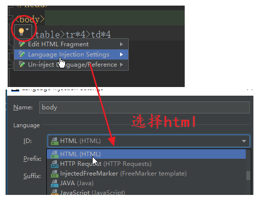 看到左上角那个黄灯后点击,选择Language Injection Settings,最后选择html即可。