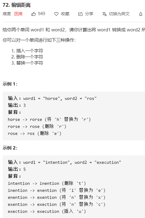 如果word1的第i个字符等于word2的第j个字符,所以对于第i个字符实际上是没有操作的, 那么编辑距离就取决于word1的1 ~ i - 1的字符和word2的1 ~ j - 1的字符, 所以我们得到: dp[i][j] = dp[i - 1][j - 1] 这个方程表示当word1的第i个字符等于word2的第j个字符,编辑距离就是将word1的1~i-1个字符改为 word2的1~j-1的编辑距离。 (至于是怎么编辑的,我们不需要管,我们只需要计算编辑距离就行了,下面同理)
