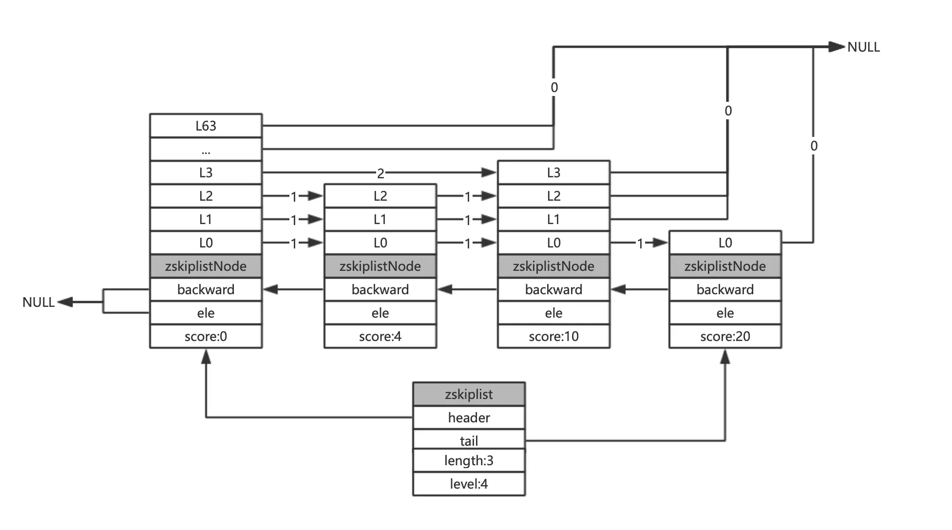 头节点:跳跃表的一个特殊节点,它的level数组元素个数为64。头节点在有序集合中不存储任何member和score值,ele值为NULL, score值为0;也不计入跳跃表的总长度。头节点在初始化时,64个元素的forward都指向NULL, span值都为0