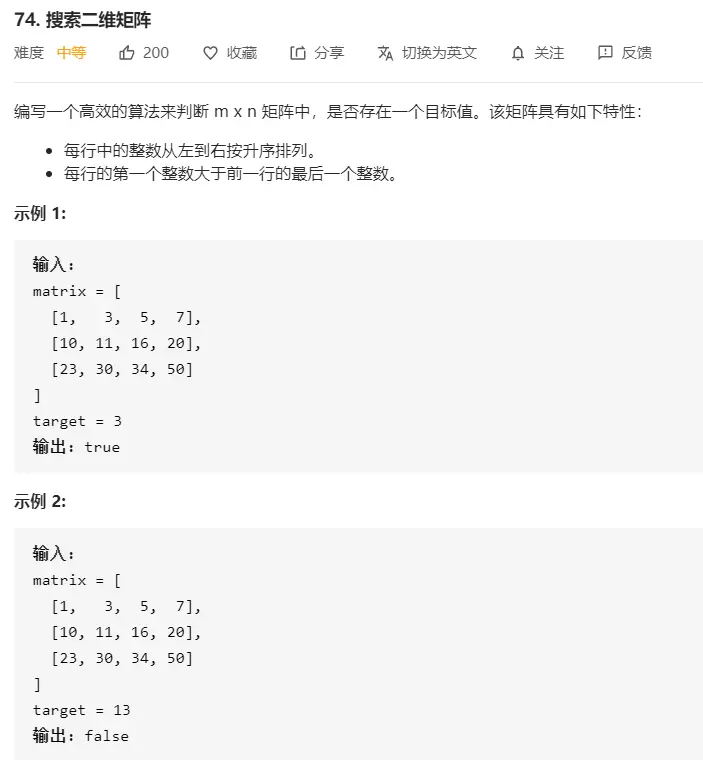 这道题是要我们在一个二维数组里搜索某个元素target,找到了返回true,没找到返回false。