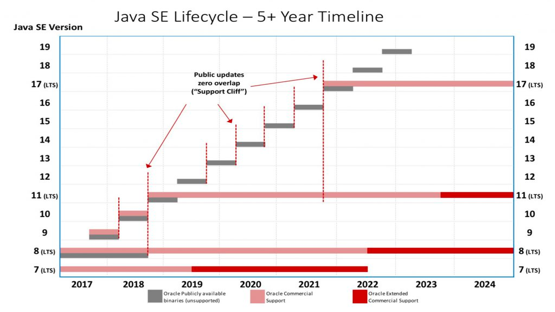 第四,提升 Java 语言开发效率。Java 9 之后,Java 像开挂了一般,一改原先一延再延的风格,严格遵循每半年一个大版本的发布策略,从 2017 年 9 月到 2020 年 3 月,从 Java 9 到 Java 14,三年时间相继发布了 6 个版本,无一延期,参见图-4。这无疑跟模块系统的引入有莫大关系。前文提到,Java 9 之后,JDK 被拆分为 94 个模块,每个模块有清晰的边界(module descriptor)和独立的单元测试,对于每个 Java 语言的开发者而言,每个人只需要关注其所负责的模块,开发效率因此大幅提升。这其中的差别,就好比单体应用架构升级到微服务架构一般,版本迭代速度不快也难。