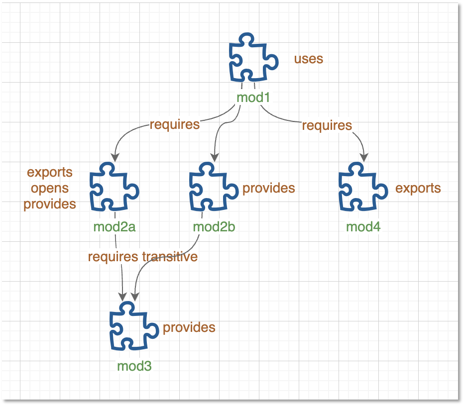 [open] module <module>: 声明一个模块,模块名称应全局唯一,不可重复。加上open关键词表示模块内的所有包都允许通过 Java 反射访问,模块声明体内不再允许使用opens语句。requires [transitive] <module>: 声明模块依赖,一次只能声明一个依赖,如果依赖多个模块,需要多次声明。加上transitive关键词表示传递依赖,比如模块 A 依赖模块 B,模块 B 传递依赖模块 C,那么模块 A 就会自动依赖模块 C,类似于 Maven。exports <package> [to <module1>[, <module2>...]]: 导出模块内的包(允许直接import使用),一次导出一个包,如果需要导出多个包,需要多次声明。如果需要定向导出,可以使用to关键词,后面加上模块列表(逗号分隔)。opens <package> [to <module>[, <module2>...]]: 开放模块内的包(允许通过 Java 反射访问),一次开放一个包,如果需要开放多个包,需要多次声明。如果需要定向开放,可以使用to关键词,后面加上模块列表(逗号分隔)。provides <interface | abstract class> with <class1>[, <class2> ...]: 声明模块提供的 Java SPI 服务,一次可以声明多个服务实现类(逗号分隔)。uses <interface | abstract class>: 声明模块依赖的 Java SPI 服务,加上之后模块内的代码就可以通过ServiceLoader.load(Class)一次性加载所声明的 SPI 服务的所有实现类。