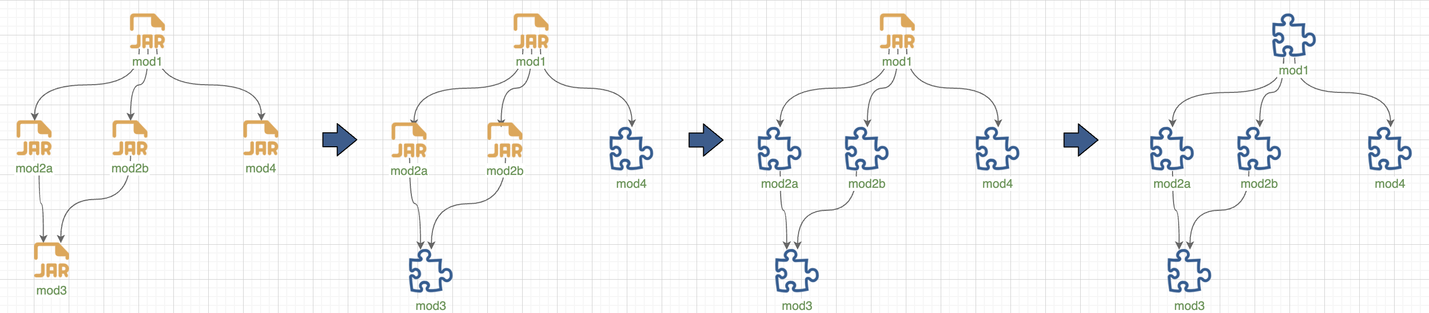 它的基本思路是,根据 jar 包依赖关系,从主应用开始,沿着依赖树自上而下分析各个 jar 包模块化改造的可能性,将 jar 包分为两类,一类是可以改造的,一类是无法改造的。对于第一类,我们仍然采用自底向上策略进行改造,直至主应用完成改造,对于第二类,需要从一开始就放入模块路径,即转为自动模块。这里就要谈一下自动模块设计的精妙之处,首先,自动模块会导出所有包,这样就保证第一类 jar 包可以照常访问自动模块,其次,自动模块依赖所有命名模块,并且允许访问所有未命名模块的类(这一点很重要,因为除自动模块之外,其它命名模块是不允许访问未命名模块的类),这样就保证自动模块自身可以照常访问其他类。等到主应用完成模块化改造,应用的启动方式就可以改为 -m 方式。